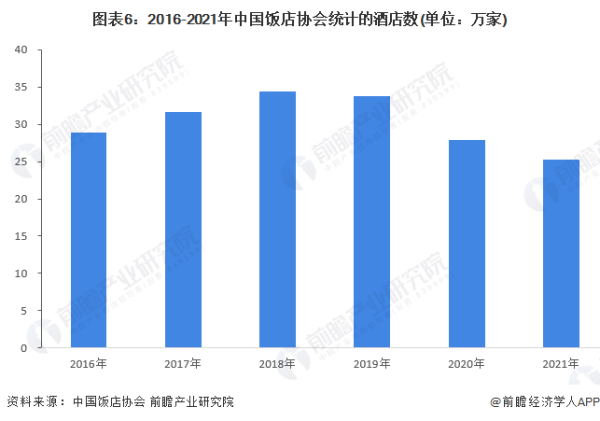 根据中国饭店协会的统计数据,2016-2021年全国酒店数量先增长后下降,2018年达到峰值为34.4万家。截止2022年1月1日(不包括被征用的隔离酒店),全国酒店业设施共计25.2万家,较2020年下降9.68%。