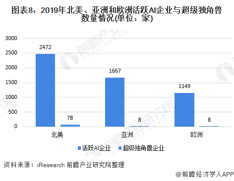 近年来,人工智能在北美洲、亚洲、欧洲地区发展愈演愈烈。北美、亚洲和欧洲是全球人工智能发展最为迅速的地区。截止2019年底,北美地区共有2472家人工智能活跃企业,超级独角兽企业78家;亚洲地区活跃人工智能企业1667家,超级独角兽企业8家;欧洲地区活跃人工智能企业1149家,超级独角兽企业8家。