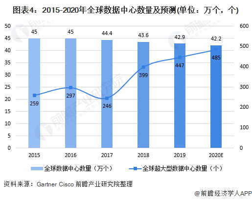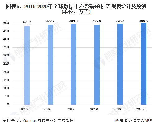根据Gartner公布的数据显示,2017年底全球部署机架数达到493.3万架,安装服务器超过5500万台,2019年全球数据中心部署的机架数量约为495.4万架。预计2020年机架数将超过498万架,服务器超过6200万台。