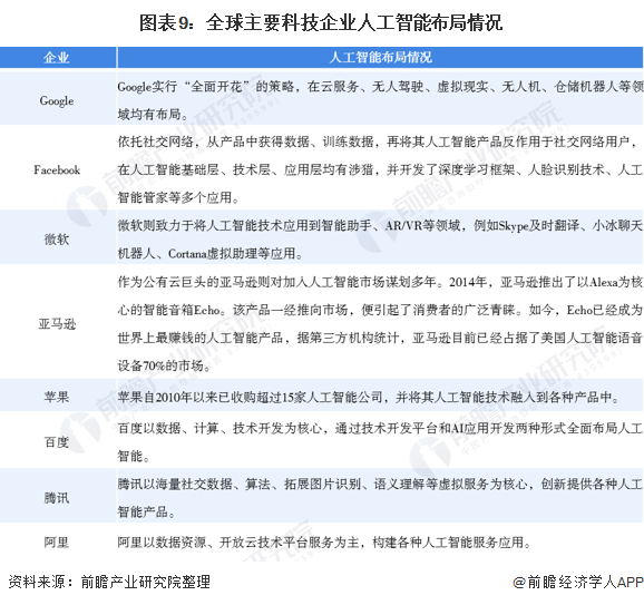 近年来,全球科技巨头纷纷布局人工智能。在美国地区,Google实行“全面开花”的策略,在云服务、无人驾驶、虚拟现实、无人机、仓储机器人等领域均有布局。Facebook依托社交网络,从产品中获得数据、训练数据,再将其人工智能产品反作用于社交网络用户。微软则致力于将人工智能技术应用到智能助手、AR/VR等领域,例如Skype及时翻译、小冰聊天机器人、Cortana虚拟助理等应用。在中国,互联网巨头企业如百度、腾讯和阿里均纷纷依托自身平台优势,构建人工智能服务产品,主要布局于人工智能应用层领域。