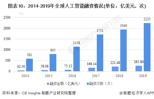 根据CB Insights公布的数据显示,2014-2019年全球人工智能融资金额和融资次数逐年增长,2019年再创新高,融资金额达到265.80亿美元,融资次数超过2000次。