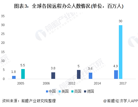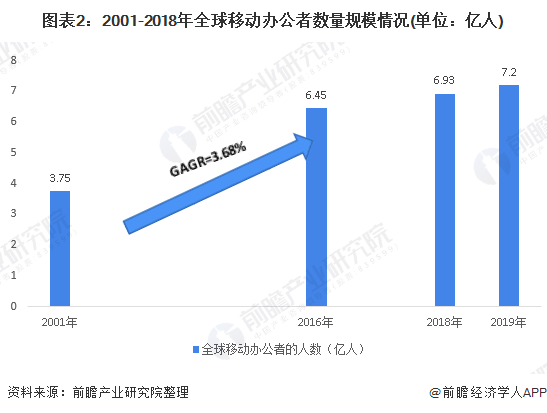 德必集团总裁贾波此前曾公开表示,在2001年的时候,全球的移动办公者的人数是3.75亿,到了2016年全球移动办公者的人数是6.45亿,复合增速为3.68%,2018年全球移动办公的人数接近7亿。未来随着移动办公概念的普及,以及企业对移动办公需求的增长,移动办公人数规模将会越来越大。