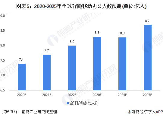 根据2001-2016年移动办公人数复合增速,结合当前全球移动办公人数规模,前瞻预测到2025年,全球移动智能办公用户使用人数将达到8.7亿人,移动办公将成为全球办公的趋势,市场前景较好。