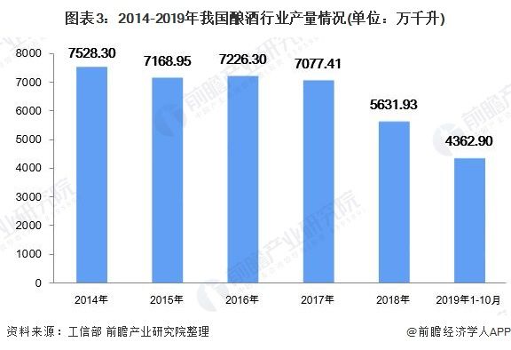 2019年1-10月,全国规模以上白酒企业累计产量达到635.1万千升,同比增长1.4%;啤酒企业累计产量达到3343.1万千升,同比增长1.0%;葡萄酒企业累计产量达到34.7万千升,同比下降10.1%。