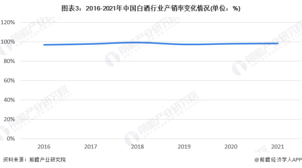 2016-2019年,我国白酒行业的产销率呈现先上升后下降的趋势。2018年,在行业产量大幅下降的情况下,去除了大量的白酒库存,实现99.30%的产销率;2019年,行业产销率下降至97.3%,比2018年的产销率下降了2%。根据2021年中国白酒(折65度,商品量)产量和销售量可以计算出,2021年中国白酒行业产销率为98.3%。