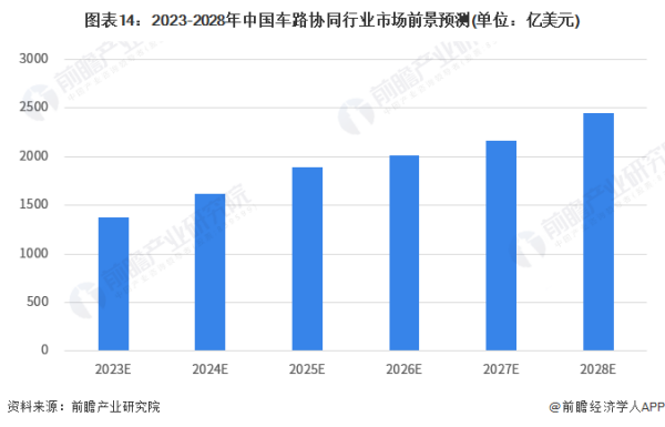 中国车路协同行业细分市场主要包括车端设备市场、路侧设备市场、云端设备市场和运营服务市场。随着中国汽车向智能化与网联化快速发展,智慧路侧设备不断在城市公路、高速公路与交叉路口铺设,云端平台、边缘计算与通信运营技术不断突破,中国车路协同行业市场空间广阔。2028年我国车路协同行业市场将达到2448亿美元,2023-2028年复合增长率为13%。