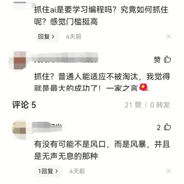 现在,大部分人都知道AI的诞生,但多数人并没有做好准备,也仅限于交流一下聊聊天就结束了,所以,真正拥抱AI,或者抓住风口的人的确很少很少。也可以这么讲,绝大多数普通人抓住这个风口的机会太难了,看看网友怎么说的: