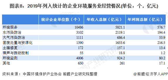 据环境保护产业协会数据,2019年我国列入统计的环境服务企业共10486个,年收入总额为5281.1亿元,年利润总额为576.7亿元。