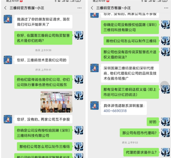 为了证实国潮是否正规有授权我去三维码公司加了官方客服咨询,客服回复说国潮三维码公司是他们代理商,代理公司的品牌及技术在做市场推广(见聊天截图)
