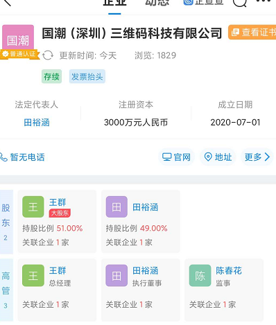 朋友圈宣传的三维码购买公司是国潮(深圳)三维码科技有限公司,该公司法人田裕涵。王群为大股东(占股51%),而王群又是三维码(厦门)信息技术有限公司的法人兼执行董事,陈绳旭又是100%持股(下图),说明国潮三维码公司是有授权的。