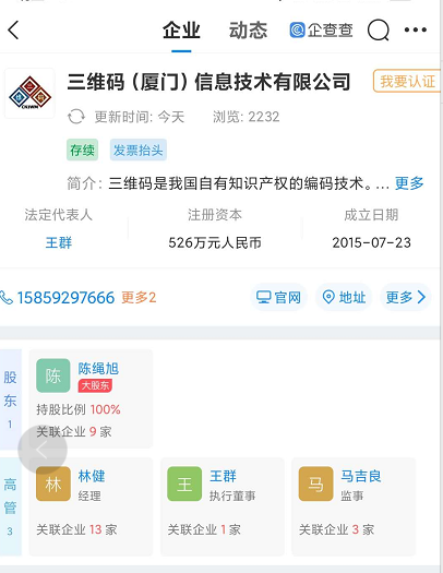 首先我们来看三维码公司背景,是三维码(厦门)网络科技有限公司研发,发明人陈绳旭,2015年成立并申请相关211项专利,公司股权结构陈绳旭占股65.4%、马吉良21%、福建省招标采购集团占10%(国有独资企业),、王秋婉3.6%(下图)