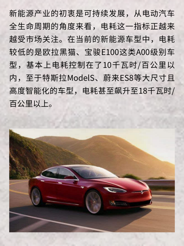 新能源产业的初衷是可持续发展,从电动汽车全生命周期的角度来看,电耗这一指标正越来越受市场关注。在当前的新能源车型中,电耗较低的是欧拉黑猫、宝骏E100这类A00级别车型,基本上电耗控制在了10千瓦时/百公里以内,至于特斯拉ModelS、蔚来ES8等大尺寸且高度智能化的车型,电耗甚至飙升至18千瓦时/百公里以上。