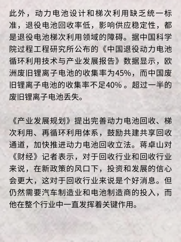 《产业发展规划》提出完善动力电池回收、梯次利用、再循环利用体系,鼓励共建共享回收通道,加快推进动力电池回收立法。蒋卓山对《财经》记者表示,对于回收行业和回收行业来说,在新政策的风口下,投资和发展的信心会更大,这对于回收行业来说是个好消息。但仍然需要汽车制造业和电池制造商的投入,而他在整个行业中一直发挥着关键作用。