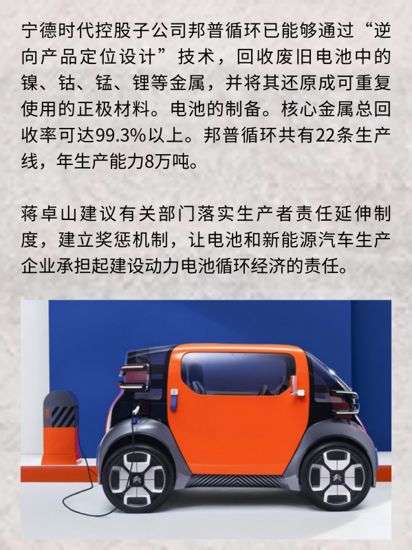 蒋卓山建议有关部门落实生产者责任延伸制度,建立奖惩机制,让电池和新能源汽车生产企业承担起建设动力电池循环经济的责任。