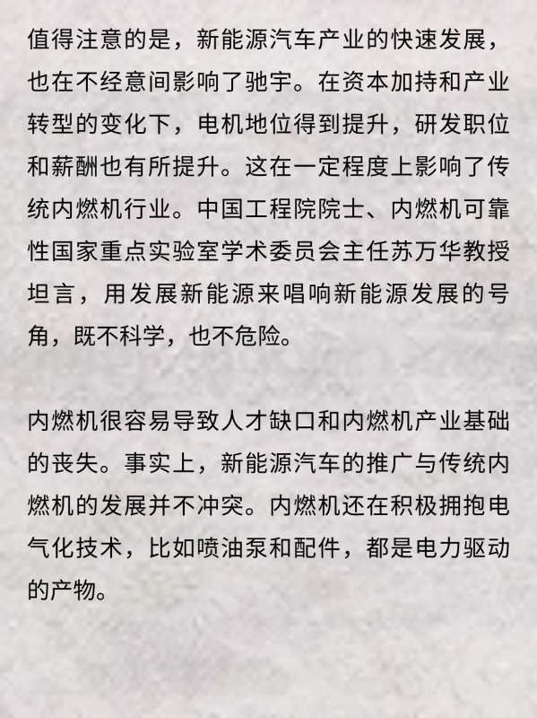 值得注意的是,新能源汽车产业的快速发展,也在不经意间影响了驰宇。在资本加持和产业转型的变化下,电机地位得到提升,研发职位和薪酬也有所提升。这在一定程度上影响了传统内燃机行业。中国工程院院士、内燃机可靠性国家重点实验室学术委员会主任苏万华教授坦言,用发展新能源来唱响新能源发展的号角,既不科学,也不危险。