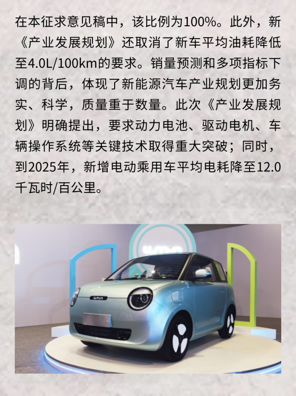 在本征求意见稿中,该比例为100%。此外,新《产业发展规划》还取消了新车平均油耗降低至4.0L/100km的要求。销量预测和多项指标下调的背后,体现了新能源汽车产业规划更加务实、科学,质量重于数量。此次《产业发展规划》明确提出,要求动力电池、驱动电机、车辆操作系统等关键技术取得重大突破;同时,到2025年,新增电动乘用车平均电耗降至12.0千瓦时/百公里。