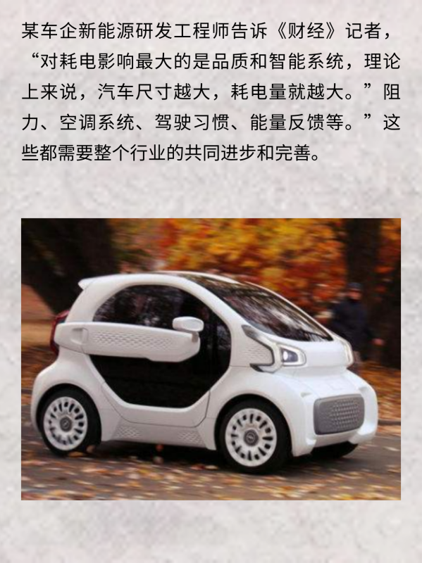 某车企新能源研发工程师告诉《财经》记者,“对耗电影响最大的是品质和智能系统,理论上来说,汽车尺寸越大,耗电量就越大。”阻力、空调系统、驾驶习惯、能量反馈等。”这些都需要整个行业的共同进步和完善。