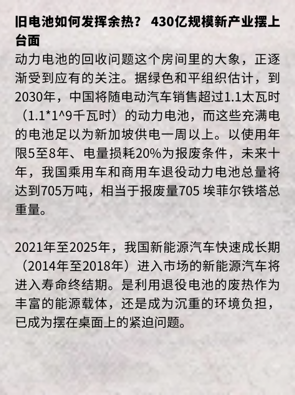 2021年至2025年,我国新能源汽车快速成长期(2014年至2018年)进入市场的新能源汽车将进入寿命终结期。是利用退役电池的废热作为丰富的能源载体,还是成为沉重的环境负担,已成为摆在桌面上的紧迫问题。