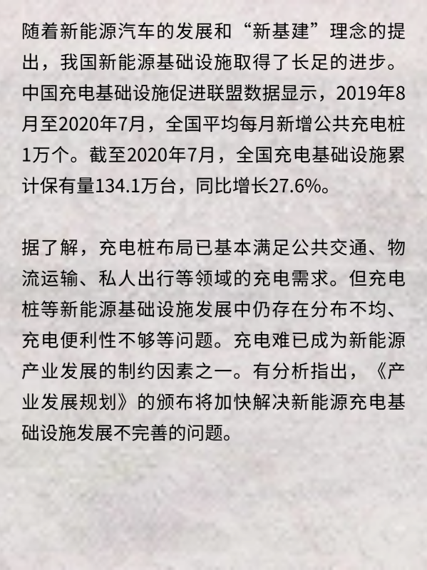 据了解,充电桩布局已基本满足公共交通、物流运输、私人出行等领域的充电需求。但充电桩等新能源基础设施发展中仍存在分布不均、充电便利性不够等问题。充电难已成为新能源产业发展的制约因素之一。有分析指出,《产业发展规划》的颁布将加快解决新能源充电基础设施发展不完善的问题。