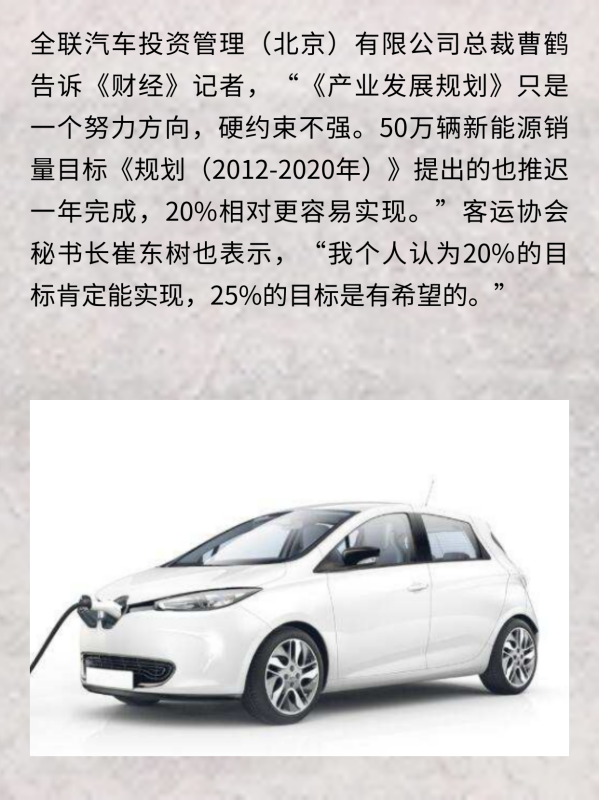 全联汽车投资管理(北京)有限公司总裁曹鹤告诉《财经》记者,“《产业发展规划》只是一个努力方向,硬约束不强。50万辆新能源销量目标《规划(2012-2020年)》提出的也推迟一年完成,20%相对更容易实现。”客运协会秘书长崔东树也表示,“我个人认为20%的目标肯定能实现,25%的目标是有希望的。”