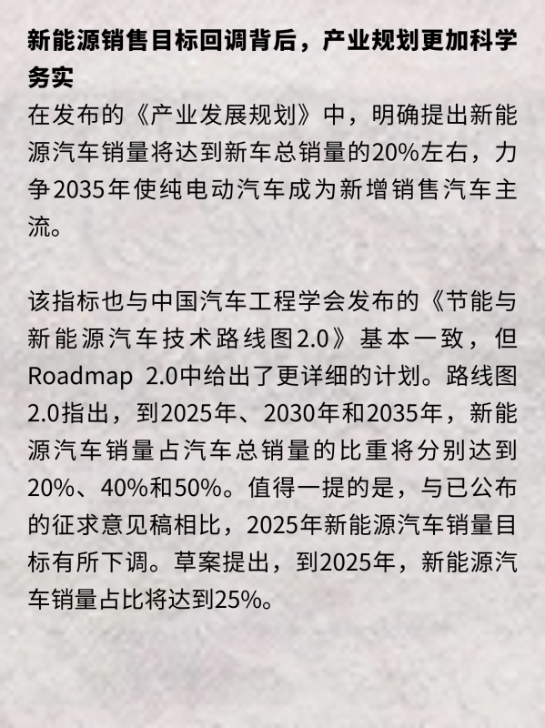 与已公布的征求意见稿相比,2025年新能源汽车销量目标由25%下调至20%。业内专家认为,新目标更容易实现。销量预测和多项指标下调的背后,体现了新能源汽车产业规划更加务实、科学。除了在数量上弱化硬指标外,《产业发展规划》还注重关键技术和基础设施的建设,这意味着新能源汽车产业正在逐步从重质向质变。