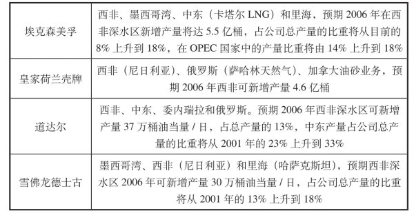 埃克森美孚西非、墨西哥湾、中东(卡塔尔LNG)和里海,预期2006年在西非深水区新增产量将达5.5亿桶,占公司总产量的比重将从目前的8%上升到18%,在OPEC国家中的产量比重将由14%上升到18%皇家荷兰壳牌西非(尼日利亚)、俄罗斯(萨哈林天然气)、加拿大油砂业务,预期2006年西非可新增产量4.6亿桶道达尔西非、中东、委内瑞拉和俄罗斯。预期2006年西非深水区可新增产量37万桶油当量/日,占总产量的13%,中东产量占公司总产量的比重将从2001年的23%上升到33%雪佛龙德士古墨西哥湾、西非(尼日利亚)和里海(哈萨克斯坦),预期西非深水区2006年可新增产量30万桶油当量/日,占公司总产量的比重将从2001年的13%上升到18%