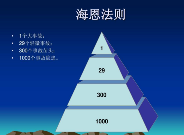 海恩法则是德国飞机涡轮机的发明者帕布斯·海恩提出的一个在航空界关于飞行安全的法则。“海恩法则”旨在说明,每一起严重事故的背后,必然有29次轻微事故和300起未遂先兆以及1000起事故隐患。该法则强调两点:
