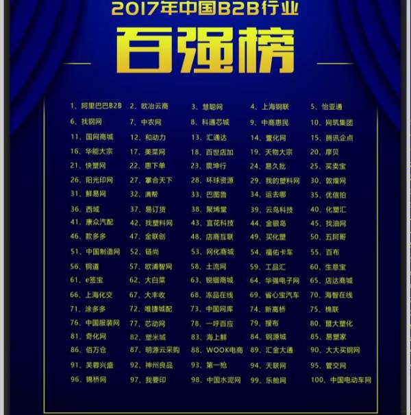 b2b企业有阿里巴巴、欧冶云商、慧聪网、上海钢联、怡亚通、找钢网、中农网、科通芯城、中商惠民、网筑集团、国网商城、华能大宗、快塑网等等。