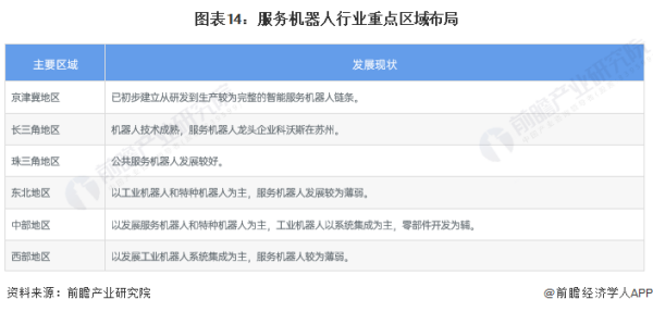 从各区域的重点布局来看,京津冀地区、长三角地区、珠三角地区和中部地区服务机器人行业发展相对较好,集中度也较高。