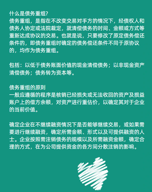 债务重组是指在不改变交易对手方的情况下,经债权人和债务人协定或法院裁定,就清偿债务的时间、金额或方式等重新达成协议的交易。即债务重组时确定的债务偿还条件不同于原协议的,均作为债务重组。债务重组一般包括资产清偿债务、债务转为资本等方式。关于债务重组的原则,一般应遵循的程序是核销已经损失或无法收回的资产及损益账户上的借方余额,对资产进行重估价,以确定其对于企业的当前价值。