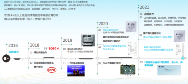黑芝麻智能科技有限公司成立于2016年,分别在硅谷、上海成都、深圳、武汉、重庆、新加坡成立研发及销售中心,目前有超过500名员工,核心团队均来自博世、OV、英伟达、安霸、微软、高通、华为、中兴等业内顶尖公司,平均拥有15+年的行业经验。2018年3月 在柏林跟博世签署战略合作协议12月与比亚迪签署第一个前装环视算法量产授权协议2019年8月 发布自动驾驶芯片华山A500,可支持L2/2.5级自动驾驶系统11月 与一汽签署5年战略合作协议2020年6月 发布自动驾驶芯片华山A1000,可支持L3/L4级别自动驾驶系统7月 获得ISO26262认证上汽集团基于A500产品量产一汽集团前装合同签署9本土品牌能否打破车规级芯片的竞争壁垒?丨汽车产经