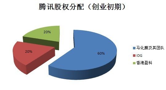 腾讯创业初期(约1999年),马化腾及其团队持股60%,IDG和香港盈科数码各自分享腾讯20%的股份,做为交换条件,二者共向创业初期的腾讯投资220万美金。