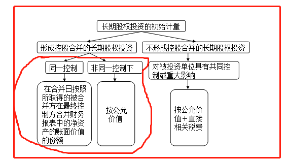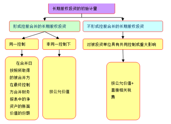 而非同一控制:购买方应当按照确定的企业合并成本作为长期股权投资的初始投资成本。企业合并成本包括购买方付出的资产、发生或承担的负债、发行的权益性证券的公允价值计量之和。