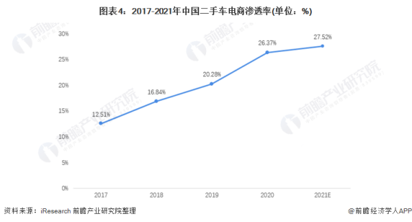 根据iResearch统计电商销售数量来看,再结合2017-2020年我国二手车销售数量,推算出我国二手车销售电商渗透率呈现逐年上升趋势,2020年我国电商渗透率达到26.37%,预计2021年或将达到27.52%。