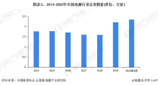 2014-2018年,中国电源行业发展平稳,企业数量增长放缓。2019年电源行业企业数量增长较快,据中国电源协会发布的《中国电源行业年鉴2020》统计数据,2019年我国电源行业共有2.22万家企业。截至2022年4月7日,在企查猫搜索得到我国注册资本在1000万元以上的电源企业(经营范围为电源的在业或存续企业),中国电源企业数量约2.35万家。