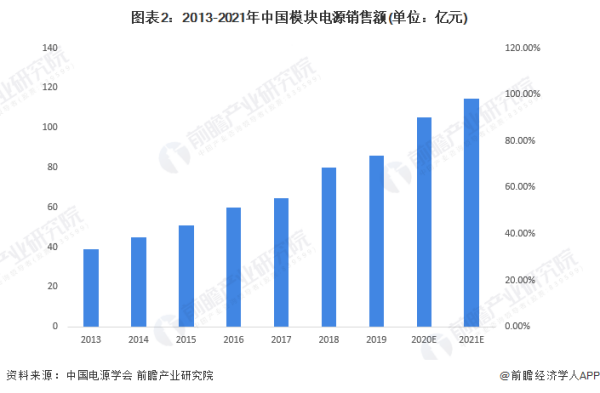 根据《中国电源行业年鉴2020》,2019年中国模块电源销售额达85.9亿元,同比增长7.38%,根据历年模块电源销售额与电源行业产值对比分析可知,模块电源销售在电源行业产值占比在逐年上涨,从2013年占比2.27%,到2019年占比3.19%,结合2020年与2021年我国电源行业产值规模与增速,再按照3.20%的占比初步测算2020年与2021年我国模块电源行业市场规模为105.2亿元与114.7亿元。