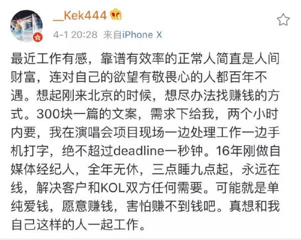 我的好朋友Kek ,92年出生。她有自己的MCN 公司和影视口碑营销公司。在微博上,可以看到她跑出国追星、时装周时去欧洲看秀,买当季时装。