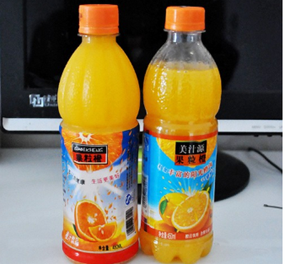 假果粒橙瓶体贴画设计比较粗糙,一经对比便可看出其低劣的品质,假果粒橙在背面还有一个地方写着“盼盼饮品”,产地也标明是“淮安市盼盼食品饮料有限公司”。另外山寨版果粒橙上面的产品质量保证标识和条纹码也有着明显的伪造痕迹,瓶体的字体设计轻佻浮躁。