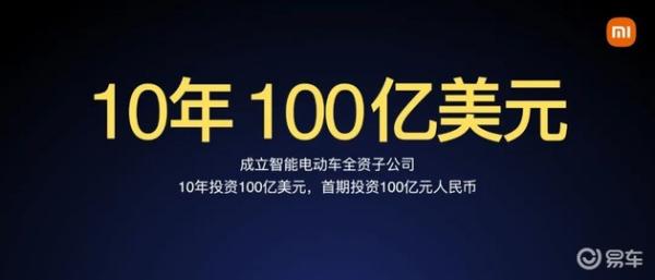 易车原创 3月30日小米集团正式宣布智能电动汽车业务立项,小米集团将成立一家全资子公司,由雷军亲自带队,首期投资为100亿元人民币,未来10年预计投入100亿美元。