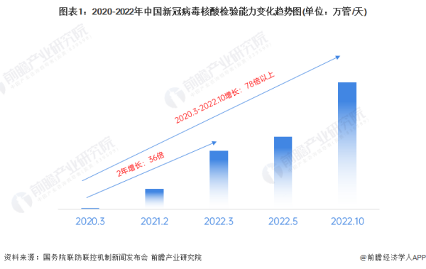 根据国务院联防联控机制新闻发布会上发言人公布的数据显示,2020年3月,中国新冠病毒核酸检验能力仅为126万管/天,经历2年,2022年3月,中国新冠病毒核酸检验能力增长了36倍,达到每天检测4500万管的水平。截至2022年10月,中国新冠病毒核酸检验能力大幅增长,其十混一的日检测能力已达亿管。