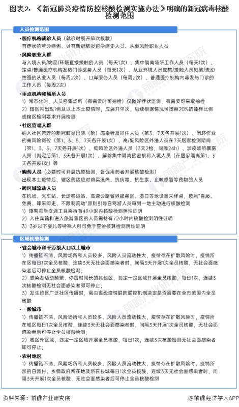 该实施办法出台后,新冠病毒核酸检测的人群覆盖以及区域范围更加精准,主要规范了更精确的人员范围、锁定了更准确的区域范围、标定了更准确的核酸频次,这均响应了《国务院联防联控机制公布进一步优化疫情防控的二十条措施》的核心“精准防控”,这样的举措实施后将对新冠病毒核酸检测行业有一定的影响。