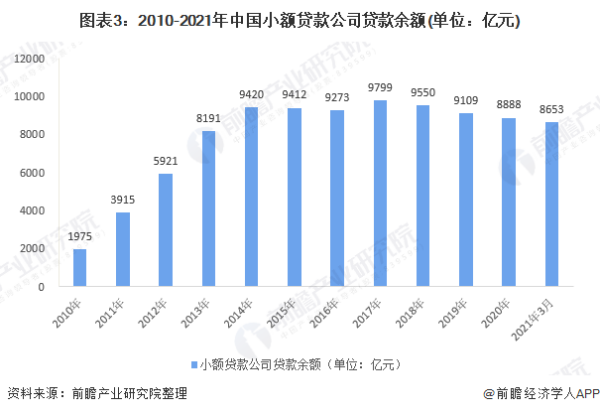 2010-2017年我国小额贷款公司贷款余额整体呈现波动上升趋势。自2018年开始,小额贷款公司贷款余额逐渐下降,截止2021年3月末,我国小额贷款公司贷款余额为8653亿元。