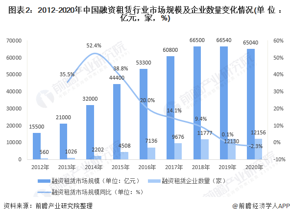 自2007年金融租赁业务开闸以来,以银行为代表的金融租赁企业迅速扩张,融资租赁行业一路高歌猛进。2012-2019年我国融资租赁市场规模一直稳步上升,但增速在2015年后开始逐年下降;2020年我国融资租赁市场规模为65040亿元,同比下降了2.3%。2020年全国融资租赁企业数量为12156家,虽然企业数量增速下降,但目前全国融资租赁企业总数还是比较大。
