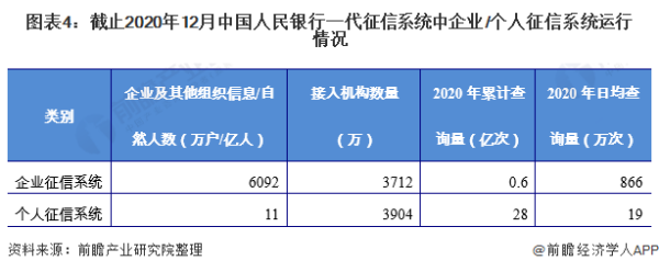 截止2020年底,征信系统收录11亿自然人、6092万户企业和其他组织的信息,规模已位居世界前列。下表为截至2020年12月底中国人民银行一代征信系统中企业/个人征信系统运行情况: