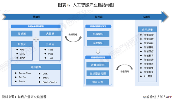 基础层主要提供算力和数据支持,主要涉及数据的来源与采集,包括AI芯片、传感器、大数据、云计算、开源框架以及数据处理服务等。技术层处理数据的挖掘、学习与智能处理,是连接基础层与具体应用层的桥梁,主要包括机器学习、深度学习、计算机视觉、自然语言处理、语音识别等。应用层针对不同的场景,将人工智能技术进行应用,进行商业化落地,主要应用领域有驾驶、安防、医疗、金融、教育等。