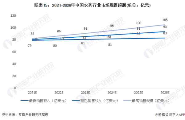从需求端来看,受益于我国农药行业经营结构的不断改善和行业集中度的不断上升,国家统计局数据显示近年来我国农药行业规模以上企业主营业务稳步增加,未来一段时间,我国农药行业发展仍将面临相对较好的市场环境。在良好的市场环境的作用下,农药行业将保持稳定发展,但是发展增速会趋于平缓。在2021-2026年间,若以5%作为我国农药行业销售收入年均增长率的上限,以1%作为我国农药行业销售收入年均增长率的下限,以3%作为我国农药行业销售收入年均增长率的理想速度。那么,到2026年,我国农药行业最高销售收入约为105亿美元,最低销售收入约为83亿美元,理想销售收入约为93亿美元。