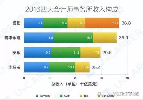 近几年来,审计业务的竞争日趋激烈且增长缓慢,而咨询业务收费远高于审计且回报率超高,四大的增长重心重新回到咨询,尤其是管理咨询上来,目前德勤近一半的收入来自咨询业务。依靠审计业务带来的充裕现金流,普华收购了博斯咨询、德勤收购了摩立特咨询。以毕马威为例,2017年审计服务的收入为103.9亿美元,年增长率为3.1%;税务咨询的收入为58.3亿美元,年增长率为5.9%;咨询业务的收入为101.8亿美元,年增长率为6%。咨询业务的收入增长目前是四大业务的主要增长来源。
