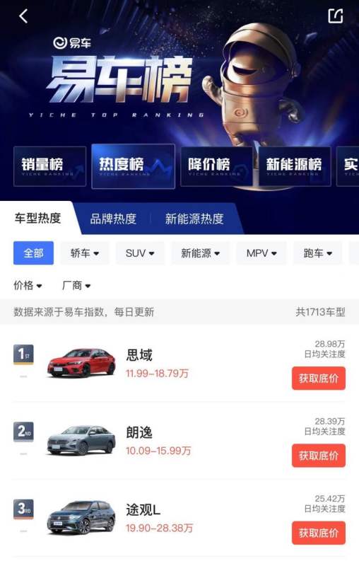 易车App提供销量、热度、点评、降价、新能源、实测、安全、零整比、保有量等榜单数据。如需更多数据,请到易车App查看。