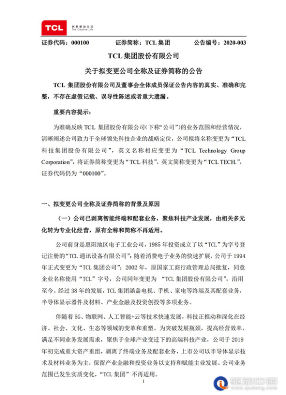 驱动中国2020年1月13日消息,在情理之中,似乎又在意料之外,2020年伊始,TCL集团就祭出了“更名”的大招来,人们耳熟能详的“TCL集团”将成追忆,面对未来,“TCL科技”有必要了解下。1月13日上午,TCL集团股份有限公司发布《关于拟变更公司全称及证券简称的公告》,公告中表示:“为准备反应TCL集团有限公司的业务范围和经营情况,清晰阐述公司致力于全球领先科技企业的战略定位,公司拟将名称变更为”TCL科技集团股份有限公司”,英文名称相应变更为“TCL Technology Group Corporation”,将证券简称变更为“TCL科技”,英文简称变更为“TCL TECH.”,证券代码仍为“000100”。”事实上,在外界看来,TCL此番更名的举动并不让人感到意外,这完全是顺利成章的事儿。我们都知道,早在2019年初,TCL就完成了重大资产重组,确定剥离终端业务及配套业务,并且上市公司以半导体显示技术材料业务为主,保留产业金融和投资业务以支持和赋能主业发展。前有TCL重大资产重组,后有TCL将自家的名称由TCL集团变更为TCL科技,由此我们可以看出,此番更名更多的原因在于:公司业务范围已发生实质变化,原有的“TCL集团”不再适用TCL业务剥离后的状况。而站在消费者的立场上来看,尽管经过此次的重组更名,这全然宣告了一个传统家电巨头的转身,但取而代之的则是,TCL轻装上阵专注于高科技半导体显示器件及材料的研发,这终究也是为自个开辟了下一个战场。需要指出的是,此番TCL更名公告的发布,诚然向外界公布了TCL更名的决心以及计划,但这项更名还需得到公司股东大会审议通过,并最终以工商行政管理机关核准登记的名称为准,方能奏效。