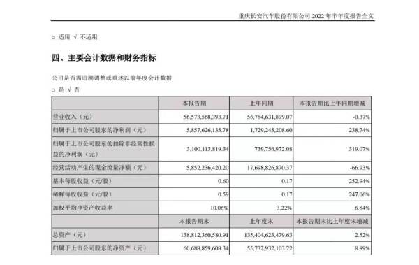 根据长安汽车半年报显示,公司今年上半年实现营收565.73亿元,同比下降0.37%,净利润达58.58亿元,同比增长238.74%,成为净利润前十排行榜中增长幅度最大的一家。